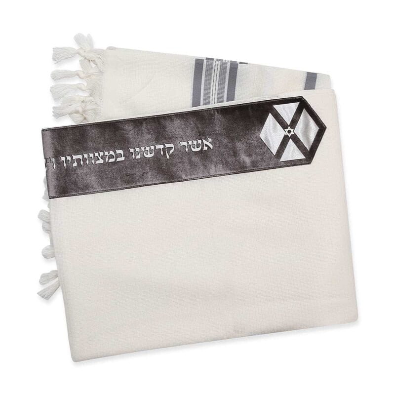 ₪ 490 – ₪ 590טווח מחירים: ₪ 490 עד ₪ 590טלית לחתונה דגם ברכה מעוינים עם מגן דוד כסף – אפור וכסף