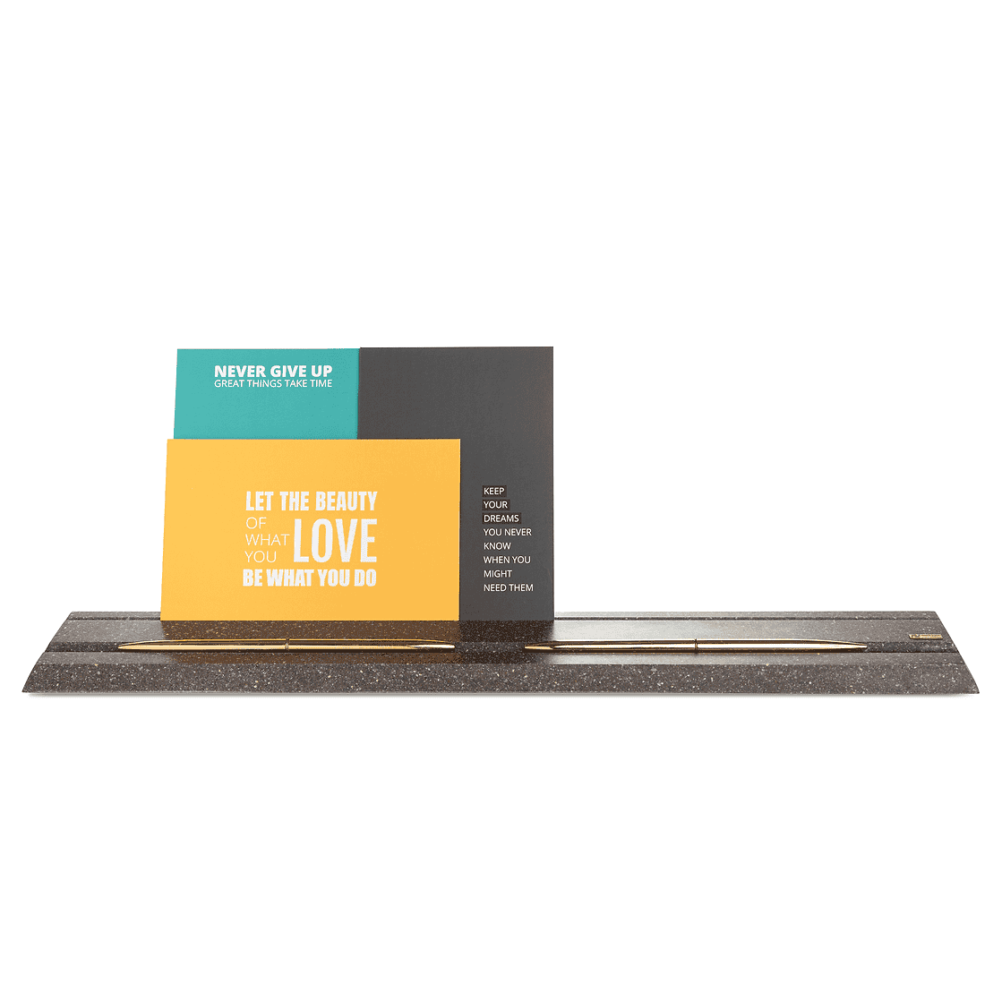 עשוי מקוריאן מחודש בתהליך ירוק ומודע לסביבה (100% UP CYCLE), הוא מתאים להנחת עטים, תמונות, גלויות או פתקים – ומציע שטח נרחב לשימוש. המעמד כולל עט מוזהב וסט גלויות השראה, והופך כל שולחן עבודה למקום מלא השראה וסטייל.