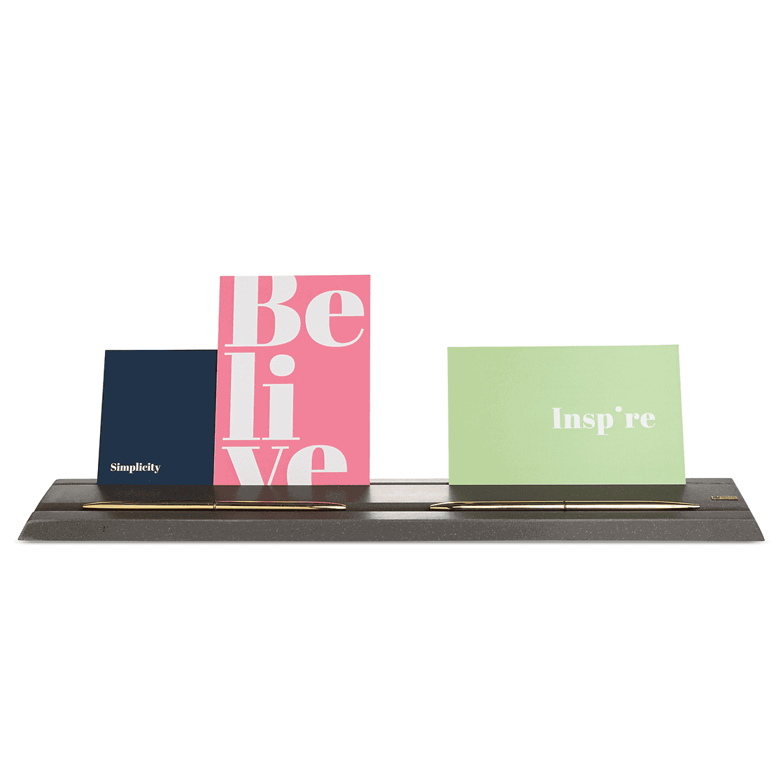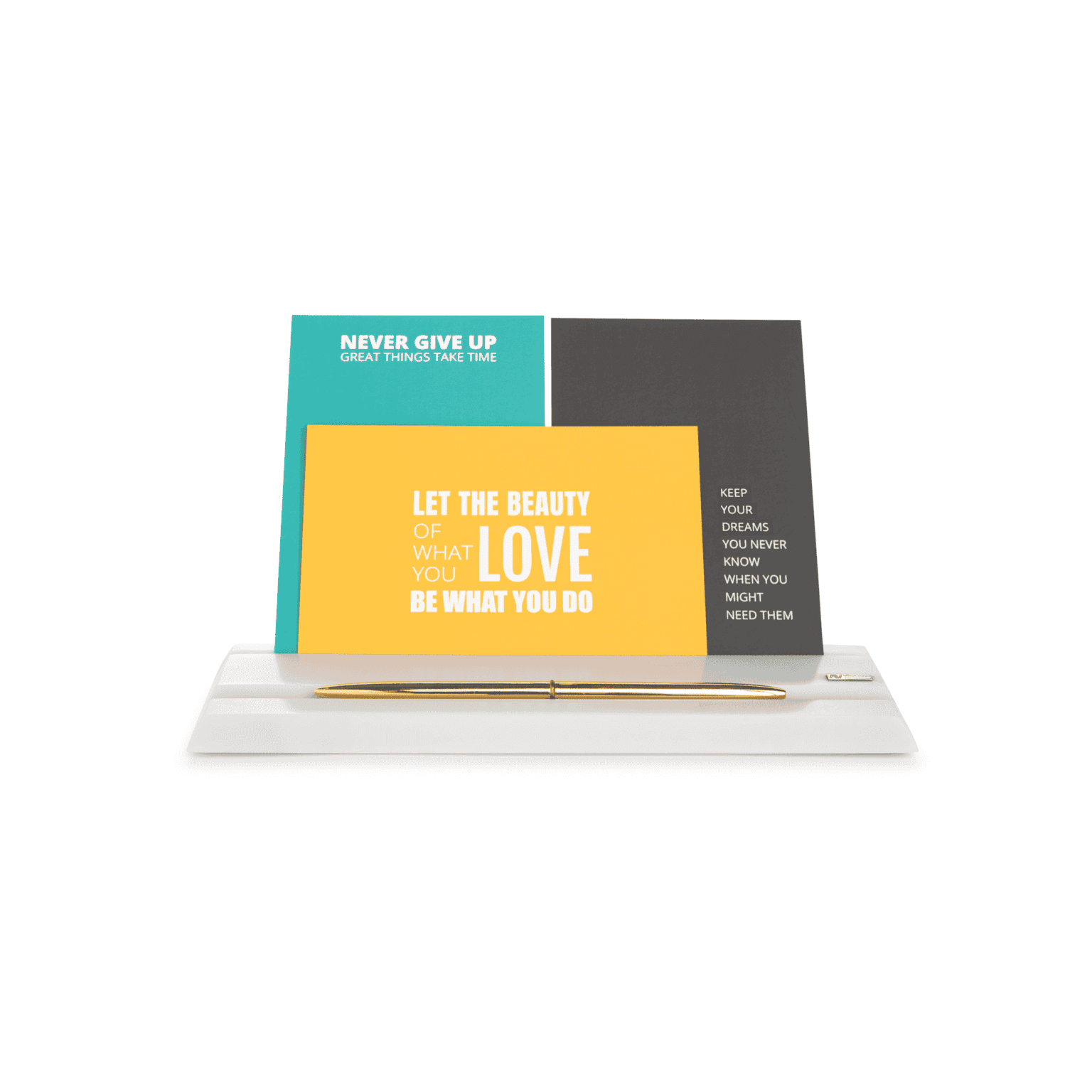 עשוי מקוריאן מחודש בתהליך ירוק ומודע לסביבה (100% UP CYCLE), הוא מתאים להנחת עטים, תמונות, גלויות או פתקים – ומציע שטח נרחב לשימוש. המעמד כולל עט מוזהב וסט גלויות השראה, והופך כל שולחן עבודה למקום מלא השראה וסטייל.