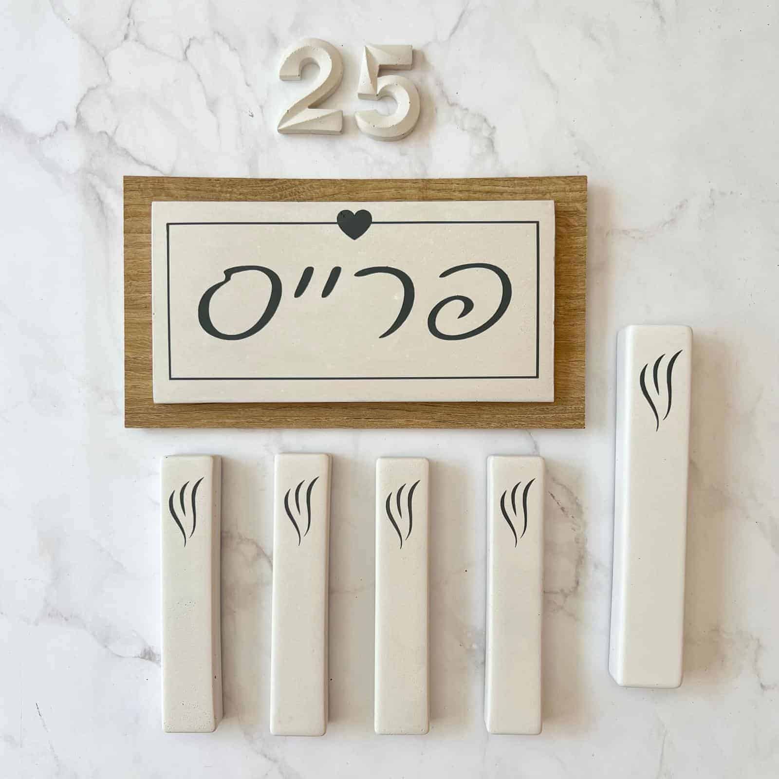מארז מתנה לבית חדש עם מזוזות, שלט ומספר בית דגם עץ
