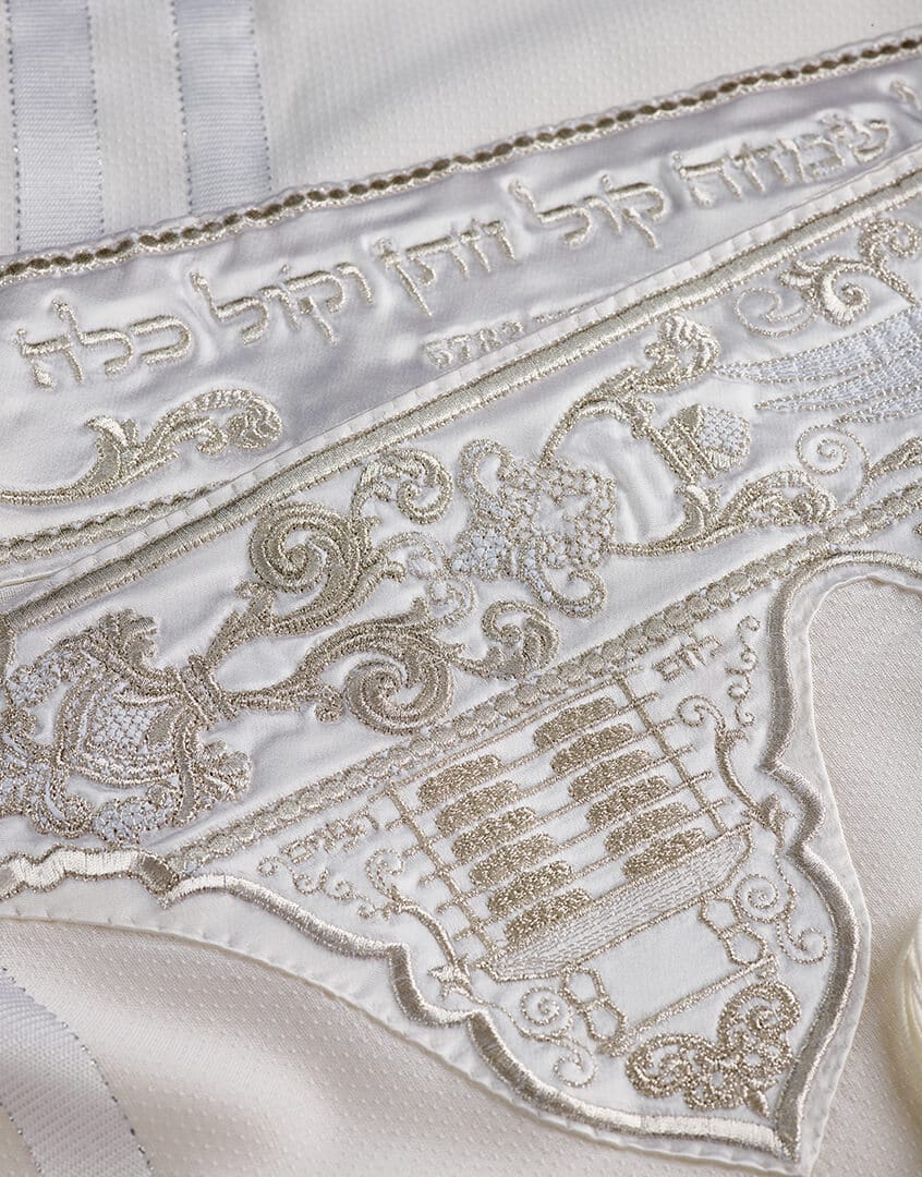 טלית צמר יוקרתית לחתן לחתונה, עוצבה בקפידה ובאלגנטיות בלתי מתפשרת לאירועים מיוחדים. המוטיבים של הטלית נלקחו מפרוכת יהודית עתיקה, בהשראתה נוצרה עטרה רקומה בחוטי כסף בטכנולוגיית תלת מימד. חוטי הכסף נארגו במיוחד עבור טלית זו, והעטרה הפנימית רקומה בשמות החתן והכלה ובתאריך החתונה, להוספת נופך אישי ומרגש. פינות הטלית דו צדדיות וגדולות מהרגיל, מעוטרות במוטיבים מהעטרה ליצירת הרמוניה מושלמת.